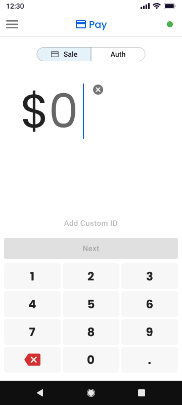 To select a transaction type, tap either Sale or Auth. The selected option will determine how the transaction is processed.