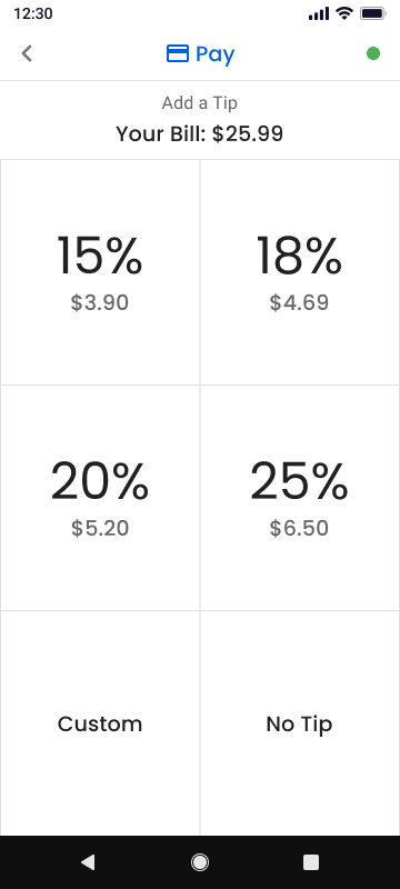 - If tipping is enabled, the Add Tip screen will appear. Select one of the available options: